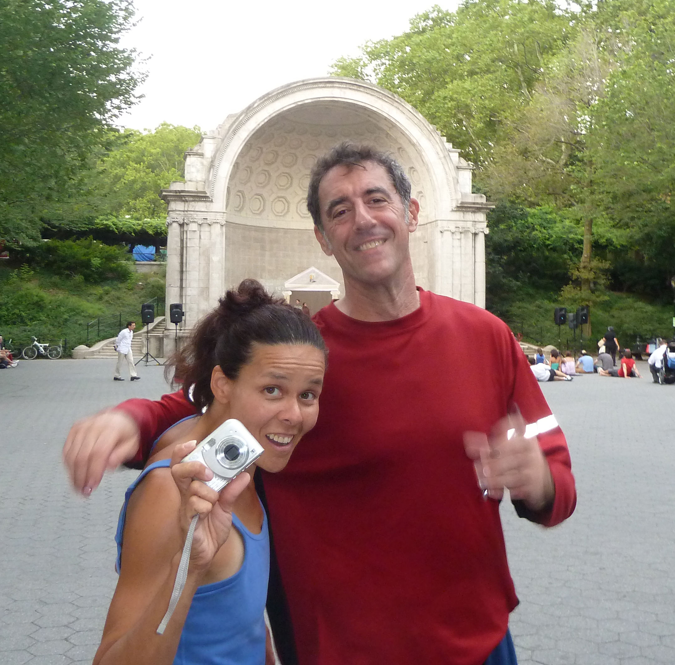 The weather here in NYC has returned to the normal August hot, humid days with constant threats of thunderstorms each afternoon. Even though we seemed to escape the rain on Tuesday and Wednesday, it did not appear we would be so lucky Thursday. As I left my house, headed to the meadow, I went back for an umbrella as the skies looked scary and the winds were scurrying in anticipation of a squall. Of course us NYers “do not need no stinkin’ conditions”, so without hesitation I continued out to Central Park. As I neared the meadow it looked oddly quiet, then I realized in fact the red flags were up and the meadow was closed. No bother, just take a left and head over to the bandshell. Personally I often prefer the bandshell. The footing is very secure and spinning is easier on the octagonal tiles, and we get extra attention from the steady stream of tourists and other pedestrians. I got concerned though as I neared the bandshell I heard a loudspeaker and saw some organized commotion. Sure enough there was preparation for a performance of “Children of Hercules” in the bandshell itself. However I saw a healthy showing of jammers and still plenty of space to get our game on.