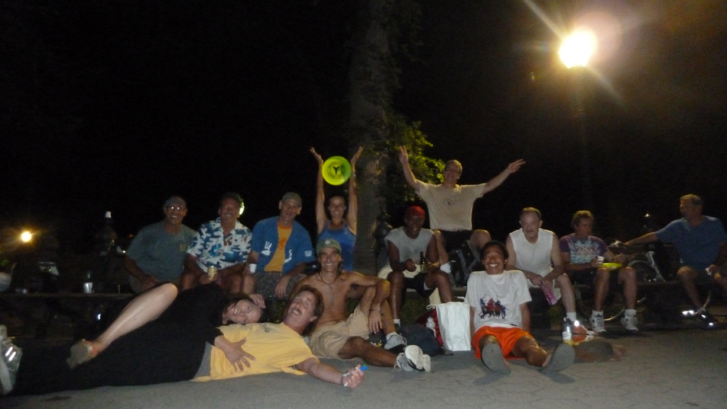 Just about all the regulars were in attendance, with the exceptions of Tall Paul, and the Oracle himself. Mr. Hudoklin is recuperating from some minor surgery and is expected to be back at full jamming speed soon. His spirit was there all day, especially when during the Greek Drama the narrator boomed “Do Not Flout the Oracle!”. We all took up this mantra, as one flouts the Oracle at their own risk. Guest jammers were also in full display, with Alan Caplin from BoTown making his second appearance in a row (could be be Yellagible soon?) and Gary Auerbach making one of his regular drop ins. We were also graced by Jim Dodelson from SoCal, fresh from his own European adventures (London Olympics and brief Amsterdam jam). And of course Char and Ryan were jamming for their third day in a row here in NYC, and Emma was jamming in full “Big Dog Inside” style. Too many jams remember details, but I personally had a great jam with Emma, and later my Stuy High Alumni Brother, Jimbo. At what seemed to the end of the day, Robert Fried sauntered by, fresh off his new job. Rob now gets in late, but does not hesitate to mix it up ASAP. It was getting dark, but Rob and Ryan started to go at it full force. Rob does not start slow, hitting double spinning crow virtually out of the box. He followed this up with Double Spinning “No Bones” Flamingitis. Ryan was holding up his end of the jam with multiple double spinning catches and fast feet to get to just about anything within human reach. I thought, OK, this is just the end of a great day, but no, oddly enough there was plenty of jamming to go. Rob and Ryan were soon joined by others and before you know it, jamming by the bandshell streetlights, a mob-op was in full force.